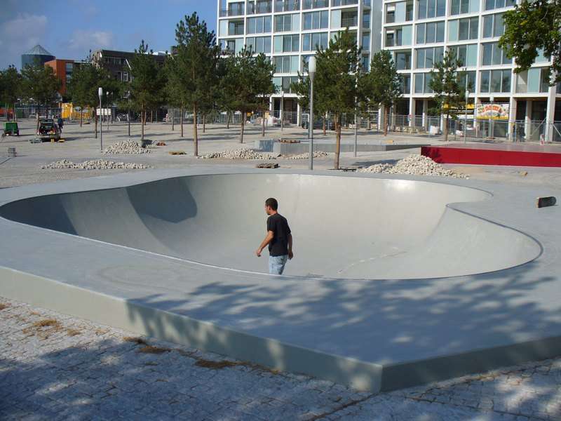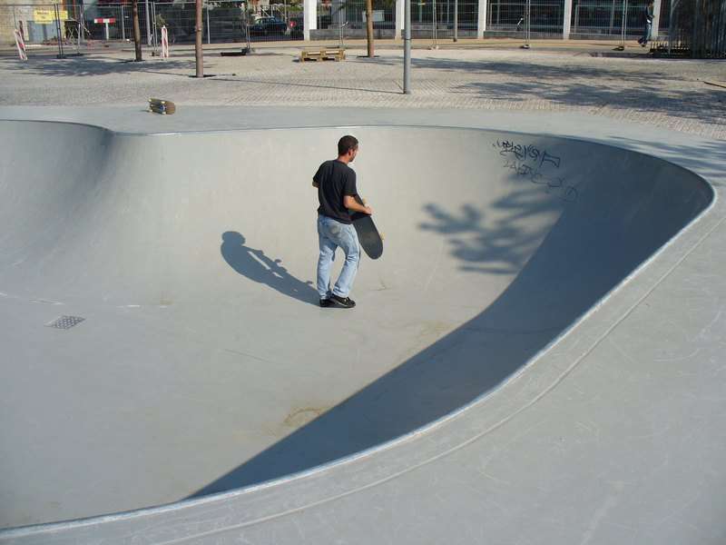 Spaßiges kleines Teil, 150 cm tief, 'ne spitze und 'ne runde Hip, verzinktes Stahlcoping. Nicht sonderlich spektakulär, irgendwie fehlt da noch ein Element wie ein Elevator oder eine sonstige Herausforderung. Aber wenn man in der Nähe ist, sollte man das Teil schon mal shredden, das wäre die Art Bowl die man gerne im Keller hätte. Der Platz drumrum wäre eigentlich genial zum skaten, viele Curbs, 'ne Monsterbank, u.s.w., allerdings ist alles aus Pflasterstein, schade.
