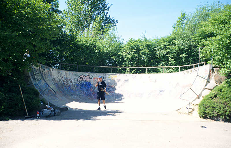 Baden Baden verfügt über eine absolut einzigartige Skateanlage (na ja, zumindest habe ich noch nichts ähnliches gesehen): einen Half-Bowl. Dieser stammt aus der grauen Vorzeit und steht einfach deshalb immer noch da, weil er in Beton ausgeführt ist. Über die Tauglichkeit dieser Anlage zum Skaten kann man streiten. Besser zum Skaten wäre sicher gewesen, wenn das Teil als geschlossener Bowl ausgeführt worden wäre. Vielleicht hatten die Erbauer schlichtweg Angst, dass jemand in den Bowl fällt und nicht mehr rauskommt. Der Half-Bowl ist jedoch sehr schön im Grünen gelegen, so dass er sich für einen Picknickausflug mit eingebauter Skatesession oder für eine Skatesession mit Picknick anbietet. Man sollte aber auf jeden Fall einen Besen mitbringen, um den Bowl auszufegen!