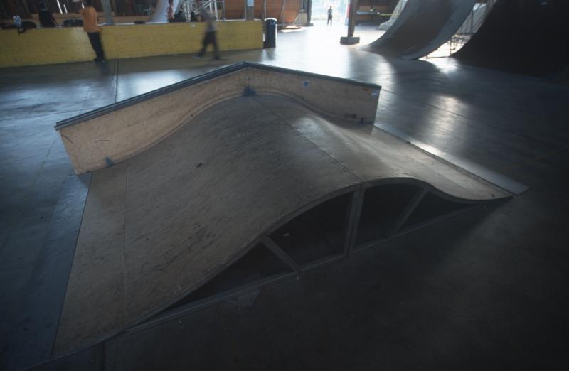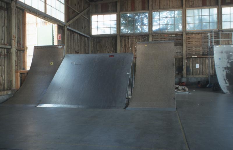 In der Landihalle stehen so ziemlich alle Arten von Rampen und Obstacles, die es gibt. Die große Half-Pipe ist allerdings fast unbrauchbar, da sie nicht starr genug ist. So verliert man beim Pushen sofort seinen Schwung und kann kaum einen Trick machen. Querlatten unter dem Belag könnten da Wunder wirken. Ein anständiger Coping wäre auch nicht schlecht. Aber das wird vielleicht noch. Die restlichen Obstacles scheinen jedoch sehr brauchbar zu sein. Die zweite Halle besteht effektiv aus zwei Hallen, da Halle IIb gewissermaßen eine Halle in der Halle ist. Man findet in den einzelnen Hallen folgendes: