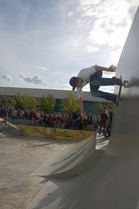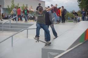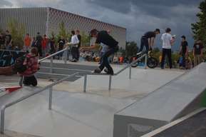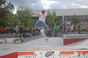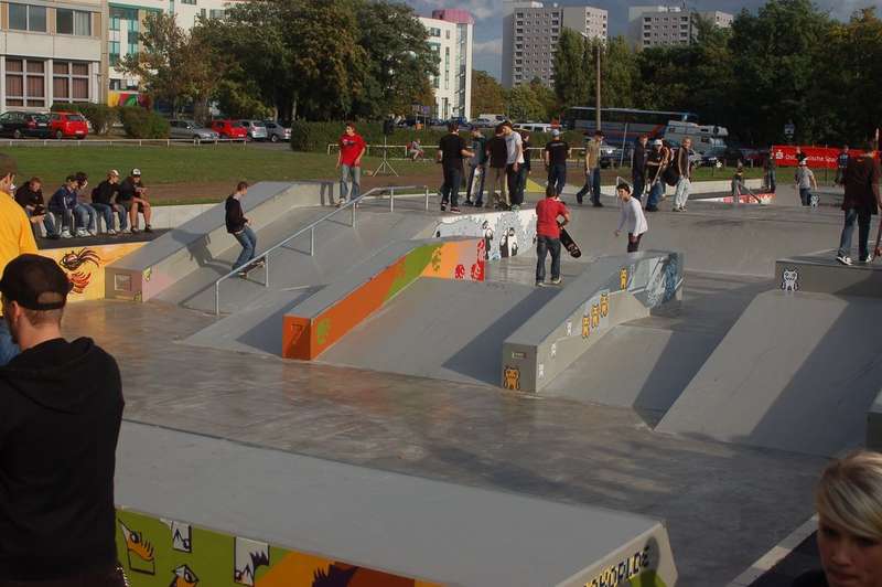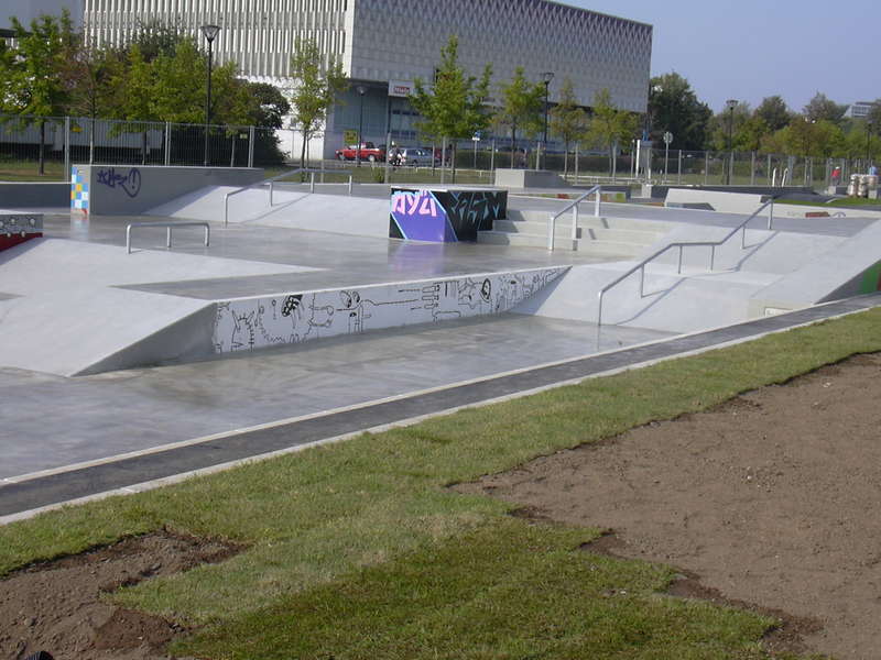 Vor dem Park ist eine große Asphaltfläche für Rollhockey oder für Oldschool-Freestyler (-: Diese beiden Plätze verbindet eine Strecke mit ein paar Bodenwellen, was ganz lustig ist. Ganz am Anfang des Parks steht eine große Halfpipe.