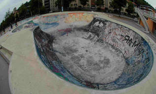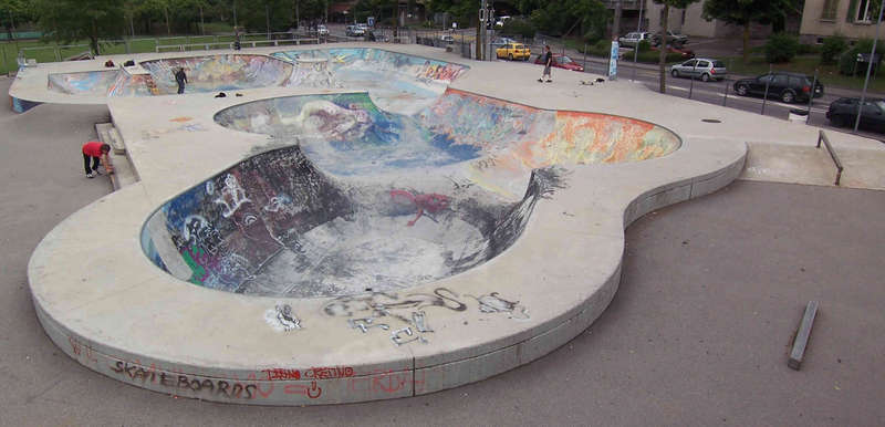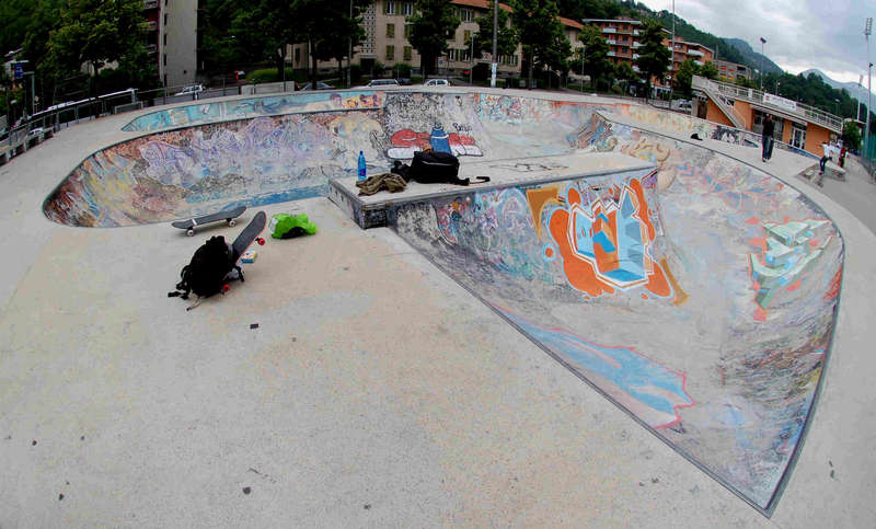 In Lugano, in der italienischen Schweiz gibt es seit ein paar Jährchen eine große Poollandschaft aus Beton, die auf Fotos zunächst mal richtig schön aussieht. Steht man dann vor Ort, sieht das Ganze plötzlich total verpfuscht aus und fährt sich auch so. Störend sind in erster Linie die flachen Transitions, die stellenweise fast schon Bank-Charakter haben. Insbesondere Im Deep-End sind die Übergänge noch dazu mit einem ordentlichen Knick versehen. Und dann wären da noch die beiden wobbelartigen Übergänge, über die man fahren muss, wenn man aus dem Snakerun in das Deep-End will. Die sind so steil, dass man da mit Vollgas unmöglich in einer direkten Linie drüber heizen kann, es sei dann man springt. So eine ähnliche Stelle gibt es auch in Annecy [F]. Auch sonst habe ich den leisen Verdacht, dass beide Parks von derselben Firma gebaut wurden.