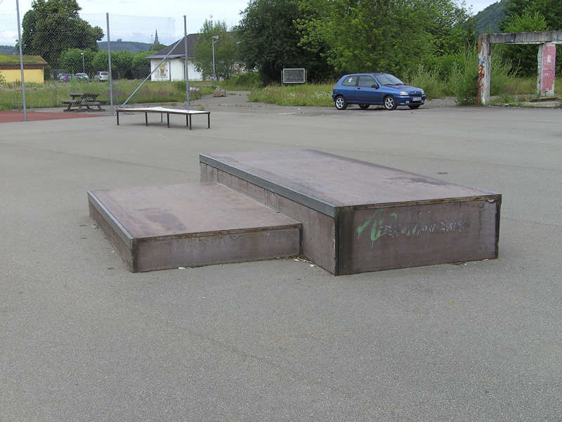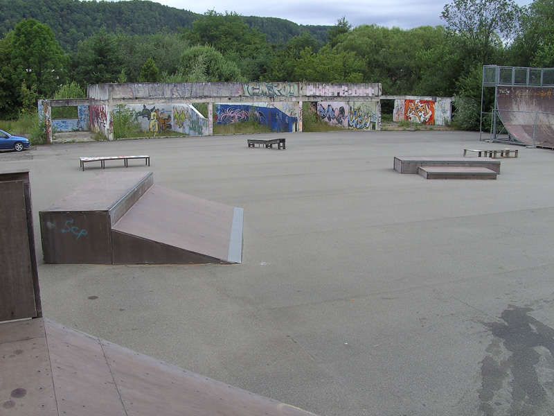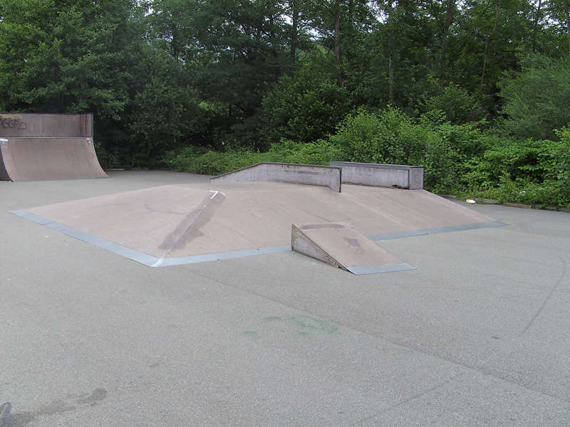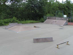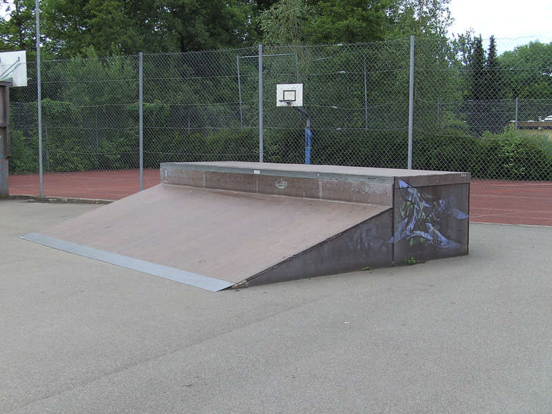 Wie auf den Bildern zu sehen, steht in der Mitte eine recht große Fun-Box mit einer Box und einem Rail. Links davon ist eine mittlere Quaterpipe und rechts davon eine sehr große Bank. In der Mitte hat diese eine kleine Quaterpipe eingebaut, die zur Zeit aber leider defekt ist. Rechts neben der Bank ist eine zweite. Sie ist nur halb so hoch. Hat aber oberhalb ein nettes Coping. Sieht man ja gut auf den Bilder. Zusätzlich ist noch eine Grindbox auf dem Platz vorhanden. Alle Obstacles sind von IOU-Ramps, aber leider schon ein bisschen in die Jahre gekommen. Der Belag ist noch in einem guten Zustand. Stellenweise sind die Kanten ein bisschen ausgerissen, was beim Skaten aber nicht stört. Immer wieder sind mal neue nette kleine Grindobjekte vorhanden, die selber gebaut sind. Immer mal wieder was Neues. Es steht auch noch eine Halfpipe auf dem Areal, aber die ist total im Arsch. Weiß nicht ob die mal wieder fit gemacht wird. Neben dran sind noch Basketballkörbe vorhanden, falls jemand noch zocken will. Und das Schwimmbad befindet sind in der Nachbarschaft, falls es einem im Sommer zu heiß wird.