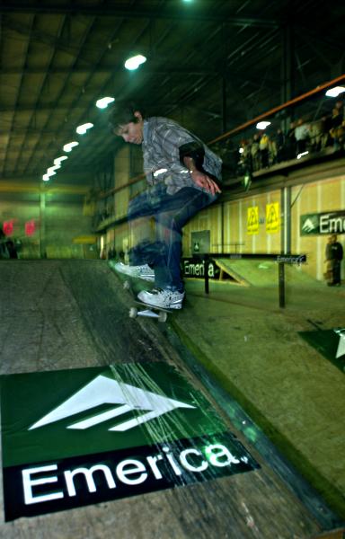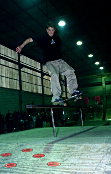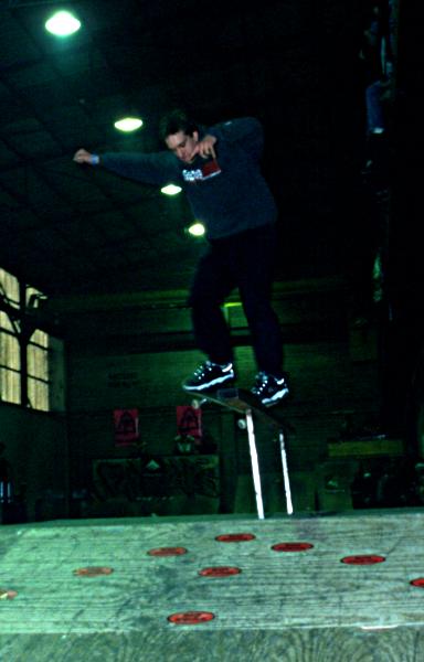 Ja, wirklich ein angenehmer Sonntag. Die Sonne schien, und die Vorfreude einen Contest auf hohem Nivau miterleben zu dürfen prickelte in meinen Knochen. Es war der Tag der Schweizer Meisterschaft 2001, ausgetragen in der Landihalle zu Basel. Zahlreiche Skater tummelten sich auf dem Streetparcours und die Seiten waren gesäumt von Zuschauern. Man mußte auch nicht lange auf den ersten Höhepunkt warten,kaum in der Halle schon stürzte sich der waagemutiger Ivan Spoti aus Lugano von der gut 4-5 Meter hohen Thaiboxhalle gen Erde, und das ganze drei erfolglose mal hintereinander. Krach machte es und das Deck war beim letzten Mal entzwei. Und schon ging es los mit den hoffnungsvollen Nachwuchstalenten, die alles gaben. Die Nervosität war allgegenwärtig und verursachte so manchen Bail. Zwischen den Elimination- und Finalläufen merkte man am deutlichsten, wie viele Teilnehmer da waren. Jeder versuchte noch einmal ein bisschen an seinen Tricks zu feilen, so dass ein heilloses Gewusel zwischen den Obstacles herrschte.