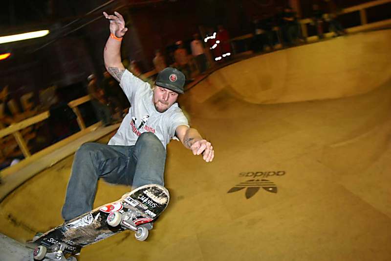 Im Bowl gaben sich dann die Leutchen eine fette Death-Jam-Session. Das Ganze eher in familiärem Ambiente, ohne Musik, nur zu dem trockenen Sound von ‚FS 5-0’ und ‚BS carve’. Sebastian Daurel flowte, Thomas Madsen heizte, Jamie Fontecilla auch, Nicky Guerrero stickt zum Ende seines Runs einen FS-540-Handplant in der Wall, wobei er seine Cap verliert : Ich will auch so skaten können, wenn meine Glatze so groß ist. Der verrückte Finne Jussi Korhonen macht einen BS-Footplant im Wallride und verbrennt sich beim FS-Carve die Fingerkuppen. Mack McKelton hat sich die Brüstung ausgekuckt und will von dort in die Rampe hüpfen. Unter dem Geschrei der Anwesenden landet er das Ding nach etwa fünf Versuchen. Matt Grabowski fährt seinen ganz eigenen Mosher-Style, respect to minus, Jess Andersen hat sich das Speed-Gefühl noch aus der Halfpipe aufgehoben, dann sind da noch die Herren Tobi Albert und Javier Mendiezabal, no comment, just plain skate, – und da! Gesehen? Eine fliegende Cobra! Ross Gouren kann auch Transition fahren und poppt fette FS-Ollie-One-Foots. Roman Hackl fliegt einen schönen Kickflip-Indy über die Hip, auch Thomas Kring und Christian Pelz geben ihr Bestes, aber natürlich, und das war schon vorher klar, haben auch sie nicht den Hauch einer Chance gegen Jürgen Horrwarth, der seine Mittagspausen-Rampe fährt wie im Schlaf. Switch und Alley-Oop, Rrevert, Nollie und To-Fakie – und das Betoncoping des Wallrides staubt unter dem FS-5-0. Keiner kennt die Rampe wie Jürgen. Jeder einzelne Run, den Jürgen hier in den letzten Monaten zwischen Akkuschrauber und Kreissäge zur Entspannung gefahren ist, war besser, als dein bester an deinem besten Tag. Ich schwöä.