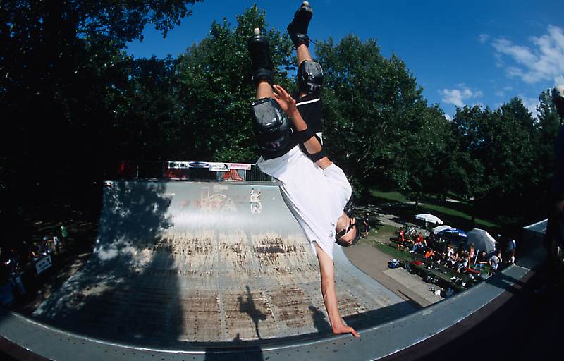 Für den Inline-Contest am Samstag traten vier Fahrer an. Zwei weitere kamen leider zu spät, waren dafür aber am Sonntag zur Best-Trick-Session am Start. Es waren auch noch mehr hochkarätige Inline-Skater anwesend, die aber den Contest nicht mitfuhren, dafür aber die Jury kompetent verstärkten. Daniel Parker zeigte sehr hohe Airs, Truespin-Top-Soul, Fakie-360°-Kindgrind und Alley-Ooop-Topside-Pornstar. Karlis Bowman beidruckte mit stylischen Combos und sehr hohen Airs. Den Mc-Twist-720° hat er sauber gedreht und ebenso den Flatspin-900°. Alois zeigt ebenfalls hohe Airs, Flips und Inverts. Isaak zeigte Airs, Grinds und hat einen sicheren Fakie Frontflip immer wieder gestanden.