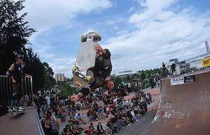Als dann der 16. (und 17. Mai) kam, war man erstaunt, daß der Contest größer aufgezogen war als vermutet: Der Verein Nouvelle-Ligne Association, bestehend aus Inline-Skatern, BMXern und Skateboardern der 2004 gegründet wurde und dem wir diesen Park zu verdanken haben, richtet einen Inline-Street und -Vert, einen BMX-Street und Skateboard-Miniramp- und Vertcontest aus. Aber auch Graffiti-Wettbewerbe, Basketball-Games und viele Sideevents gab es. Dazu Sponsoren aus dem Auto- und Mobilfunkbereich und freien Eintritt!