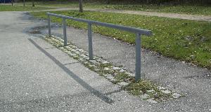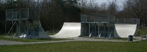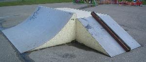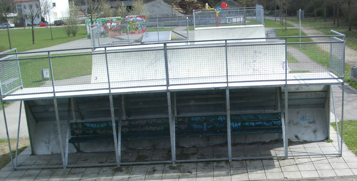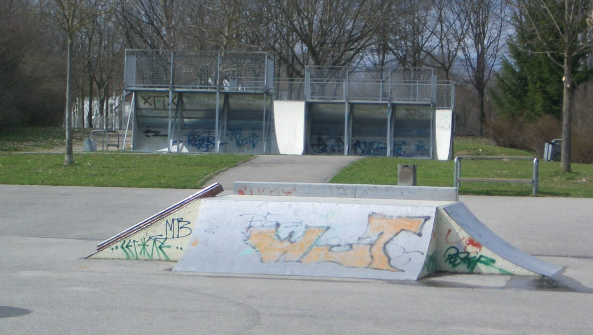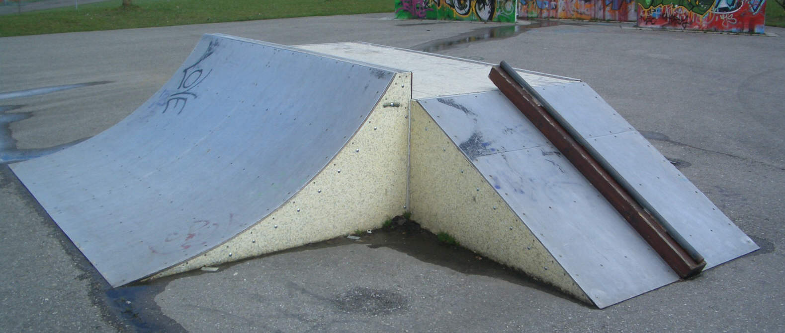 | | okay, also hier ein paar Bilder vom Skatepark in 86368 Gersthofen. Gersthofen grenzt nördlich an Augsburg an. Wenn Ihr auf der A8 unterwegs seid, fahrt Ihr an der AS72 Augsburg-West runter und auf der B2 Richtung Augsburg. Gleich an der nächsten Ausfahrt (Gersthofen-Zentrum) verlasst Ihr die B2 auch wieder und haltet Euch immer Richtung G-Zentrum. Ihr kommt am MAX BAHR Baumarkt, Media Markt und Praktiker vorbei. Links kommt dann irgendwann der MARKTKAUF, davor geht´s links weg Richtung TÜV und dann gleich wieder rechts Richtung Landratsamt (ihr fahrt quasi links um den Marktkauf Parkplatz herum), dann geradeaus unter die Autobahn durchfahren und gleich danach geht´s links in den Eichenlohweg. Dort steht ein Sportplatz und etwas weiter hinten ist ein Rollhockeyfeld, ein kleiner, abschüssiger Asphaltplatz mit ´ner komischen Funbox (schaut Euch das Rail an?!?!?!) und dahinter eine fette, relativ hohe Miniramp mit Spine. Die Funbox hat Metall-Belag, die Mini irgendsoeinen seltsamen Kunststoffbelag. Sieht nicht sooo schlecht aus, auch die Spine geht in Ordnung, nur sieht mir das ganze für´s Skateboard etwas zu hoch bzw. zu steil aus. Hab´s aber nicht ausprobiert. Also Leute, wenn Ihr mehr Spots in und um Augsburg kennt, immer her damit!!! Seid keine Frösche (oh mann, cool dass mir grad dieser old-school spruch wieder einfällt ... tststs)